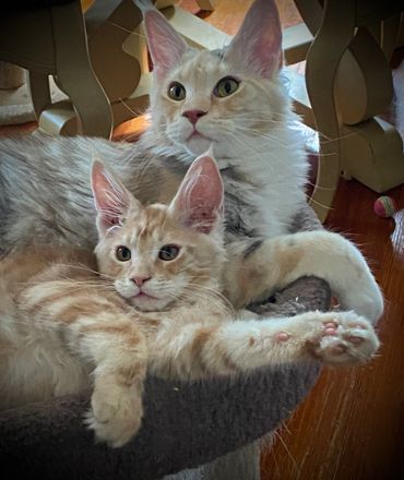 My friend Teri was so kind to let me have this very pretty cream silver tabby and white girl. She is super affectionate and she loves kittens! Yes, she plays with all our kittens. Such a great addition to our program. I hope to breed her this summer, 2026 once all her testing is done.